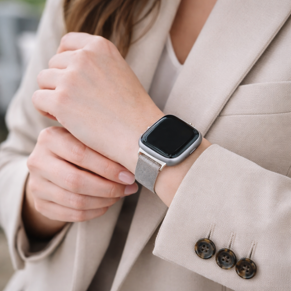The smooth stainless steel mesh wraps fluidly around your wrist, providing a sleek and modern look. The fully magnetic Milanese loop ensures infinite adjustability for a perfect fit every time.